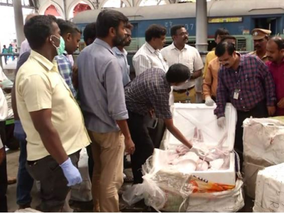 ஜோத்பூரில் இருந்து சென்னை வரும் ஜோத்பூர் விரைவு ரயிலில் முறையாகப் பதப்படுத்தப்படாத ஆட்டிறைச்சி அனுப்பப்பட்டுள்ளதாக உணவுப் பாதுகாப்புத்துறை அதிகாரிகளுக்கு ரகசியத் தகவல் கிடைத்தது. அதன்படி இன்று காலை எழும்பூர் ரயில் நிலையத்துக்கு வந்த ஜோத்பூர் விரைவு ரயிலில் உணவுப் பதுகாப்பு அதிகாரிகளும், சென்னை மாநகராட்சி சுகாதாரப் பிரிவு அதிகாரிகளும் சோதனை மேற்கொண்டனர்.