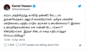 ”கர்நாடகத்திலிருந்து காவிரித் தண்ணீர் கேட்டால் துணைவேந்தரை அனுப்பி வைக்கிறார்கள். தமிழக மக்களின் மனநிலையை மத்திய மாநில அரசுகள் உணரவில்லையா? இல்லை உணரத்தேவையில்லை என எண்ணி விட்டார்களா? சீண்டுகிறார்கள். இந்தச் சீண்டல் எதை எதிர்பார்த்துச் செய்யப்படுகிறது?” என டுவிட்டரில் கேள்வி எழுப்பியுள்ளார் மக்கள் நீதி மய்யத்தின் தலைவர் கமல்ஹாசன்.