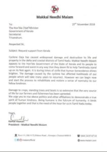 புயல் நிவாரணத்திற்காக தங்களால் இயன்ற உதவிகளை தமிழகத்திற்கு அளித்திட முன்வர வேண்டும் என்று கேரள அரசு மற்றும் மக்களுக்கு கமல்ஹாசன் கோரிக்கை விடுத்துள்ளார். இதுகுறித்து அம்மாநில முதல்வர் பினராயி விஜயனுக்கு மக்கள் நீதி மய்ய கட்சியின் தலைவர் கமல்ஹாசன் கடிதம் எழுதியுள்ளார். அந்த கடிதத்தில் கமல் கூறியிருப்பதாவது, அண்மையில் வீசிய கஜா புயல், தமிழக டெல்டா மற்றும் கடலோர மாவட்டங்களில் மக்களின் உயிருக்கும் உடமைக்கும் பெரும் பாதிப்பை ஏற்படுத்தியுள்ளது. மக்கள் நீதி மய்யம் கட்சி, கேரள அரசினையும் மக்களையும் தங்களால் இயன்ற உதவிகளை தமிழ்நாட்டிற்கு இப்பொழுது அளித்திட முன் வரவேண்டும் என்று அன்புடன் கேட்டுக்கொள்கிறது. இப்பேரிடர் காலங்களில் மனிதாபிமான உணர்வுகள் மக்களிடம் அதிகமாக மேலோங்கிட வேண்டும்.