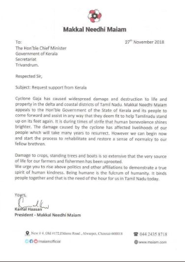 கஜா புயலின் தாக்கத்தினால் எங்கள் மக்கள் இழந்திருக்கும் வாழ்வாதாரத்தை மீட்டெடுத்து, மீண்டு வருவதற்கு இன்னும் பல வருடங்களாகும். இருப்பினும், நாம் அனைவரும் ஒன்றிணைந்து, நமது சகோதரர்களின் இயல்பு வாழ்க்கையை புனரமைக்கும் இப்பணியினை இன்றே தொடங்கிட வேண்டும். பயிர்கள் சேதாரமடைந்து, மரங்கள் வேருடன் சாய்ந்து, படகுகளை இழந்து மக்கள் தங்கள் அடிப்படை வாழ்வாதாரத்தையே இழந்து மிகக்கடுமையாக பாதிப்படைந்துள்ளனர். நாம் அனைவரும் அரசியலுக்கு அப்பாற்பட்டு, உன்னதமான மானுடக்கருணையை உணர்த்திட வேண்டிய அத்தியாவசியமான தருணம் இது. மனிதாபிமானமே மனிதத்தின் அடிப்படை உணர்வு. அதுவே நம் அனைவரையும் ஒன்றிணைக்கும் உணர்வுப்பாலம் அதுதான் இன்று இப்பொழுது, இங்கே எங்கள் தமிழ்நாட்டிற்கு மிகவும் தேவையான ஒன்று, என்று குறிப்பிட்டுள்ளார். அந்த கடிதத்தை கமல் தனது ட்விட்டர் பக்கத்தில் பதிவிட்டுள்ளார்.